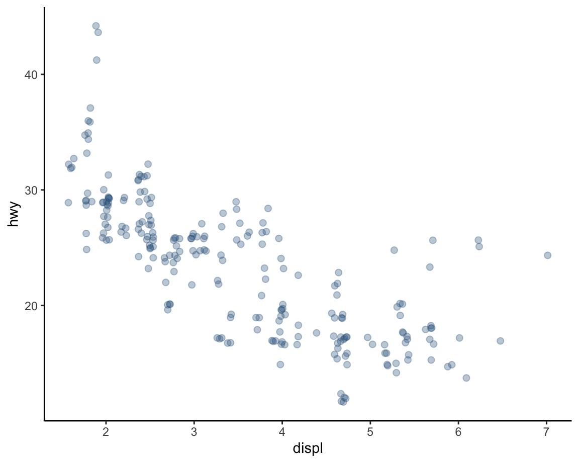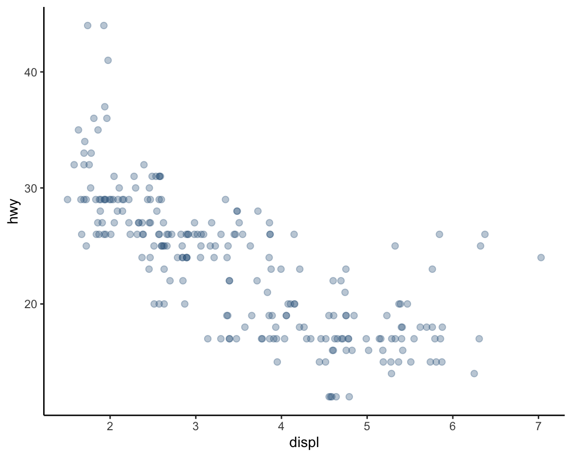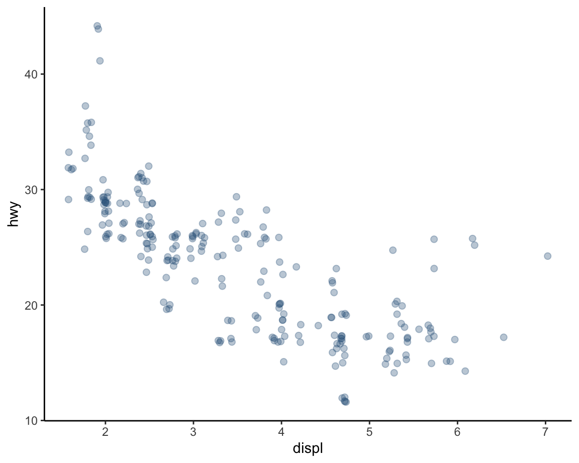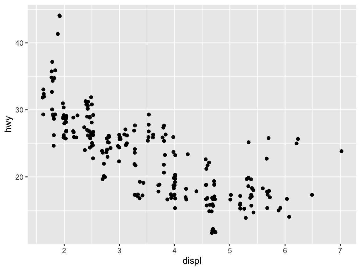 ggplot(data = mpg, mapping = aes(x = displ, y = hwy)) +