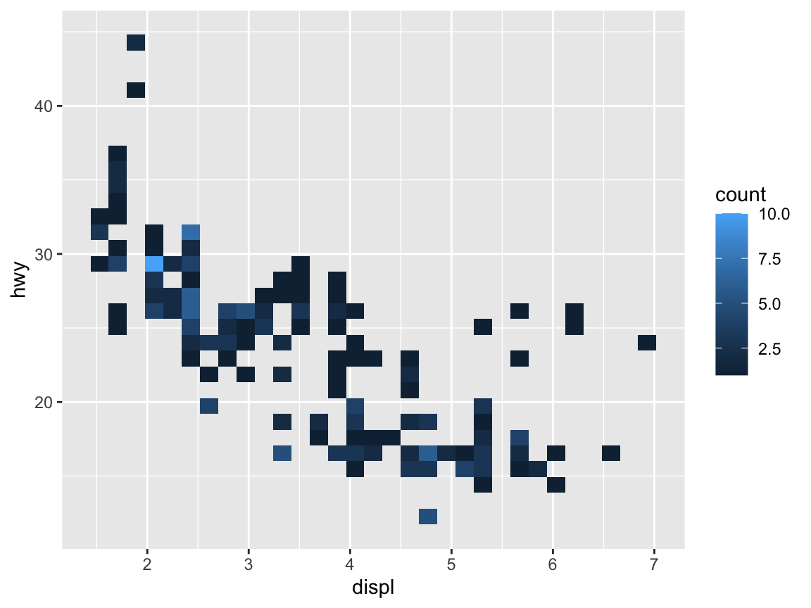 geom_bin2d(aes(x = displ, y = hwy)) # 2. specify geom + mapping