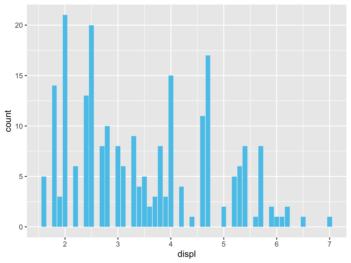 geom_bar(aes(x = displ), fill = unikn::Seeblau) # 2. specify geom + mapping