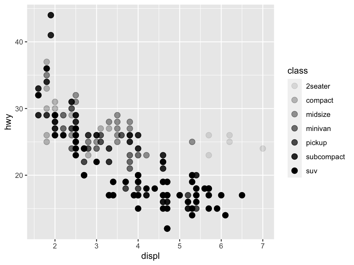 geom_point(mapping = aes(x = displ, y = hwy, alpha = class), size = 3)