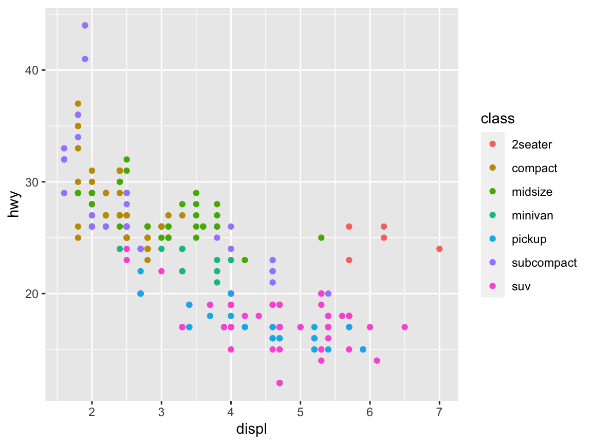 Additionally, a third variable (class) was mapped to the colors of the dots, as the legend illustrates.