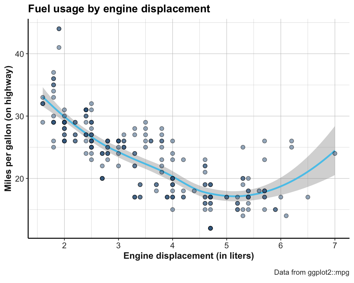Whereas the individual points show a straightforward relation between the values on the x- and y-axis (i.e., the car’s values on the variables displ and hwy), it is not immediately obvious how the y-value of the trendline is computed from the data. Generally, each geom comes with its own requirements for mappings and potentially different ways of computing statistics from the data.