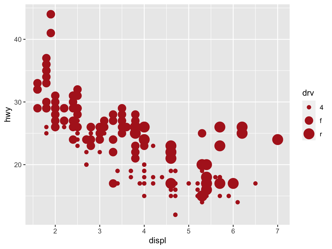 geom_point(aes(x = displ, y = hwy, size = drv), color = "firebrick")