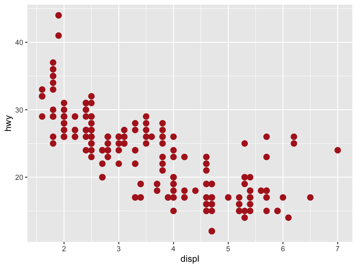 geom_point(aes(x = displ, y = hwy), color = "firebrick", size = 3)
