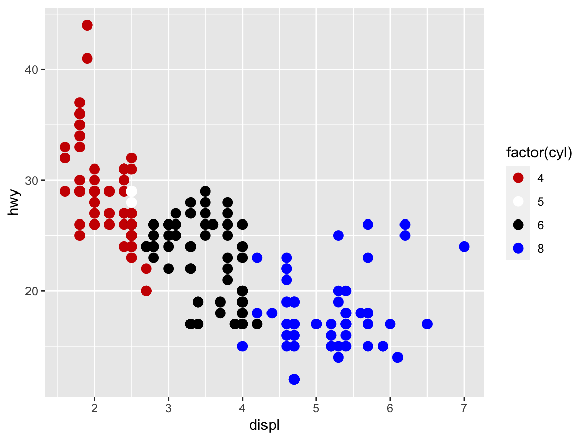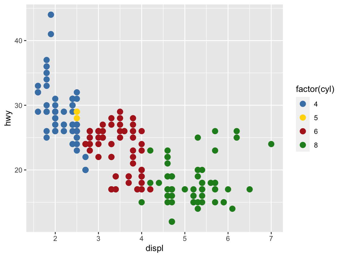 geom_point(aes(x = displ, y = hwy, color = factor(cyl)), size = 3) +