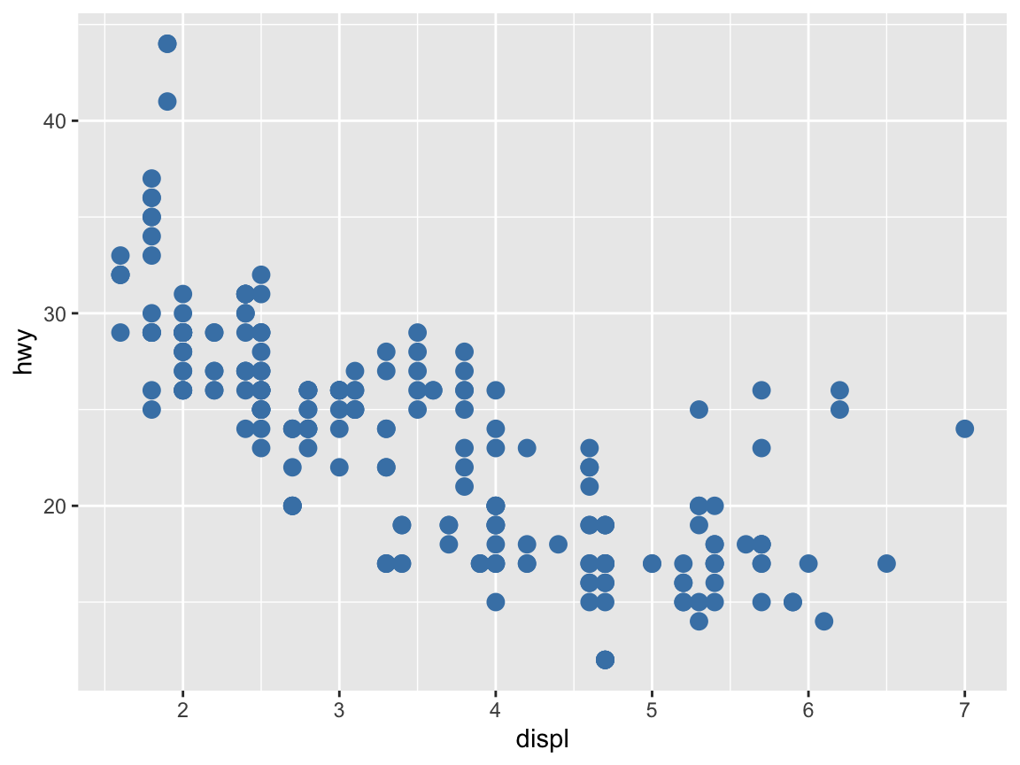 geom_point(aes(x = displ, y = hwy), color = "steelblue", size = 3)