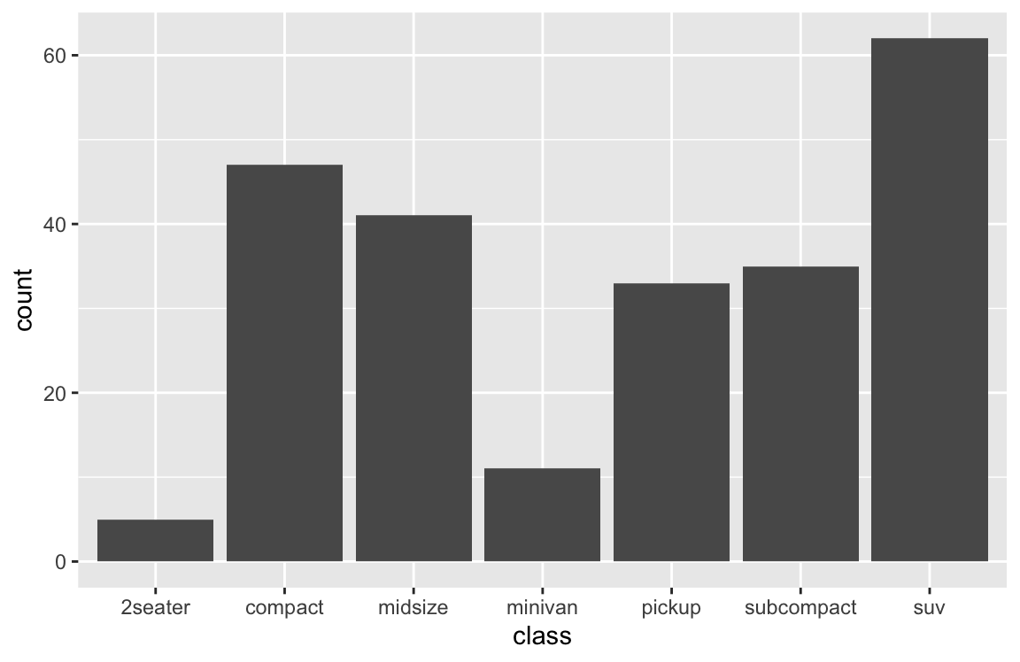 Another common type of plot shows the values (across different levels of some variable as the height of bars. As this plot type can use both categorical or continuous variables, it turns out to be surprisingly complex to create good bar charts. To us get started, here are only a few examples: