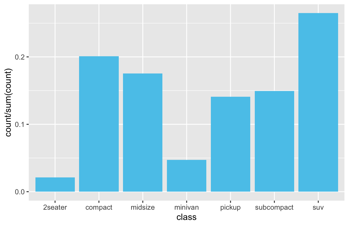 geom_bar(aes(x = class, y = ..prop.., group = 1), fill = unikn::Seeblau)