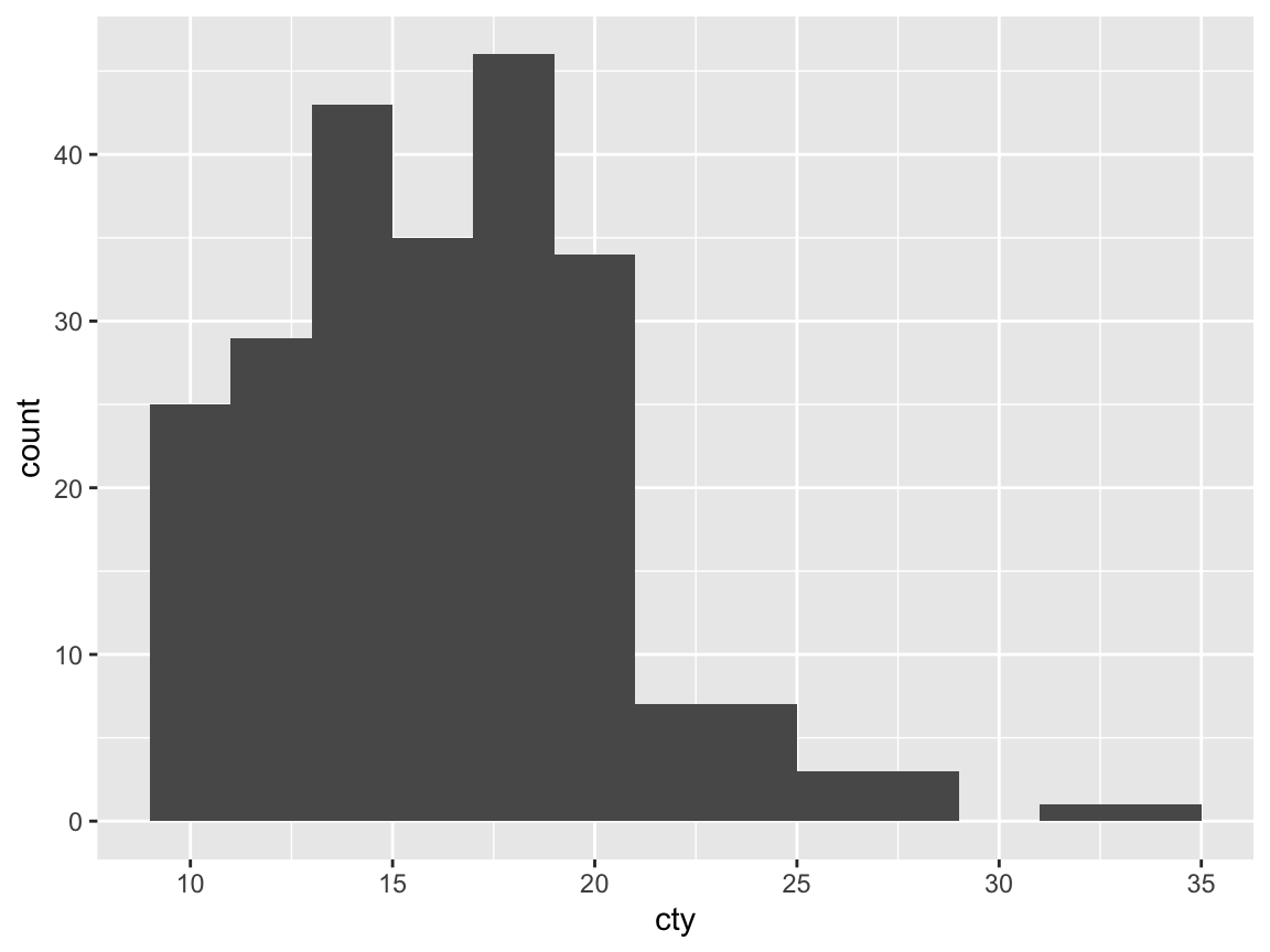 ggplot(mpg, aes(x = cty)) + # set mappings for ALL geoms