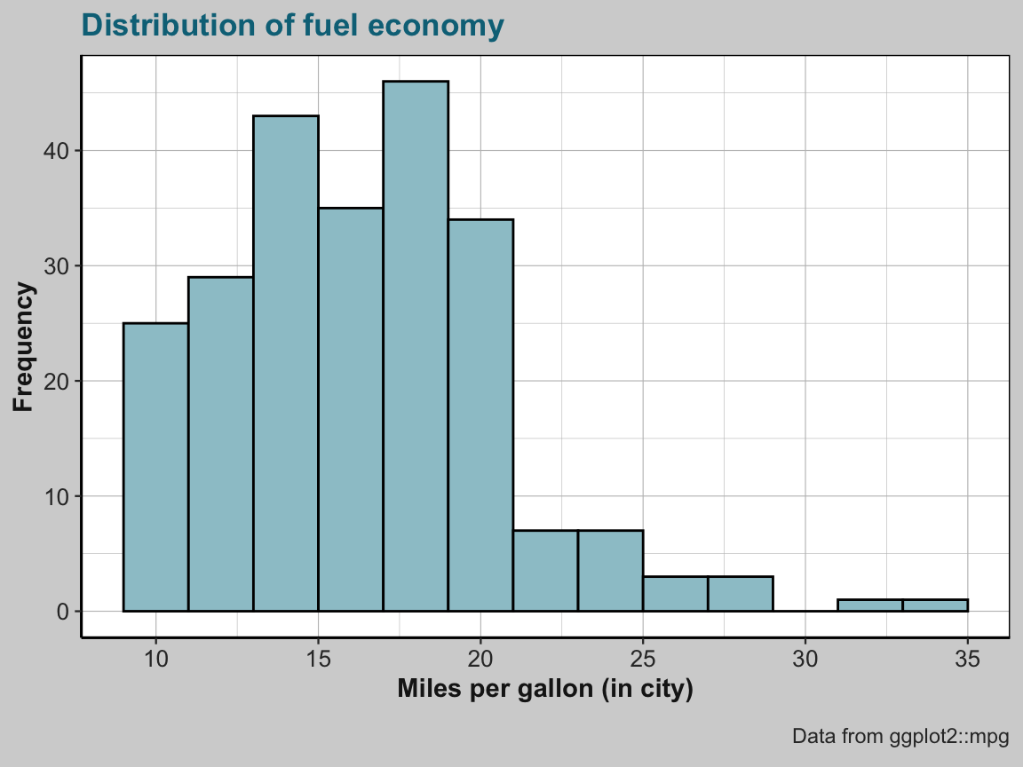 A histogram counts how often specific values of one (typically continuous) variable occur in the data. This allows viewing the distribution of values for this variable (e.g., the distribution of cars’ inner-city fuel consumption values cty):