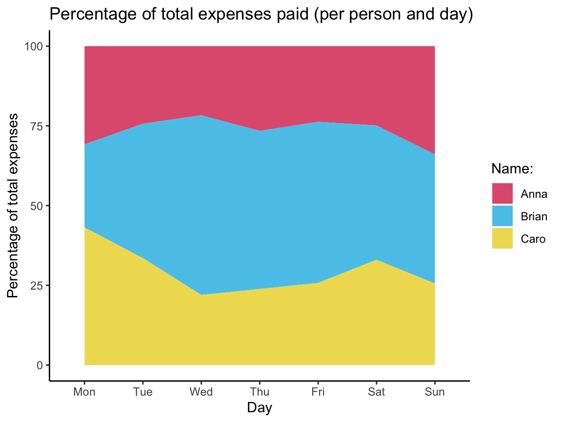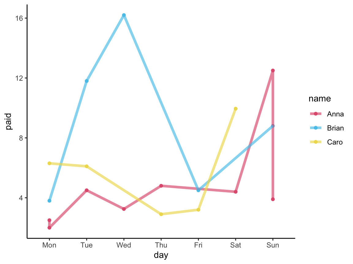 Anna, Brian, and Caro are sharing a flat and keep a record of the items that each of them purchased for the household. At the end of each week, they use this data to balance their account. As an aspiring data scientist, you offer your help. Here’s last week’s data: