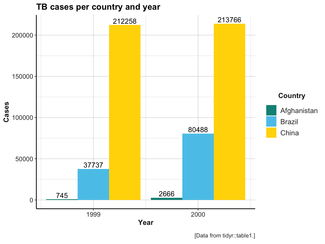 As we have seen in Section 3.1.1, the same data (e.g., the values of a variable) can be organized in many different ways. Transforming the shape of data without changing any values is known as reshaping data, as opposed to reducing or enhancing data. In this chapter, we extend the notion of “reshaping data” to different forms of rectangular tables. As a starting point, consider the following bar plot, which shows the absolute number of TB cases documented by the World Health Organization for three countries (Afghanistan, Brazil, and China) in two years (1999 and 2000):