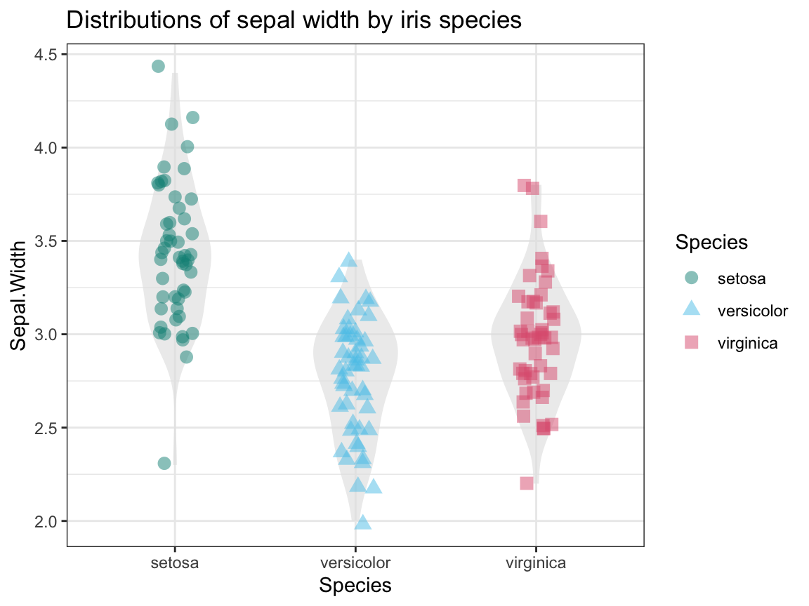geom_jitter(aes(color = Species, shape = Species), size = 3, alpha = 1/2, width = .10) +