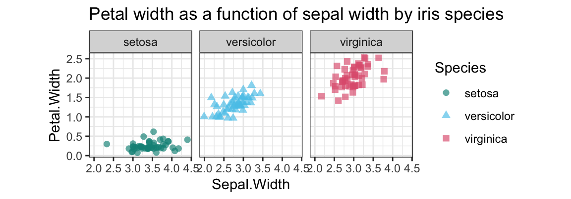 Petal.Widthas a function ofSepal.Widthseparately (i.e., in three facets) for each species.