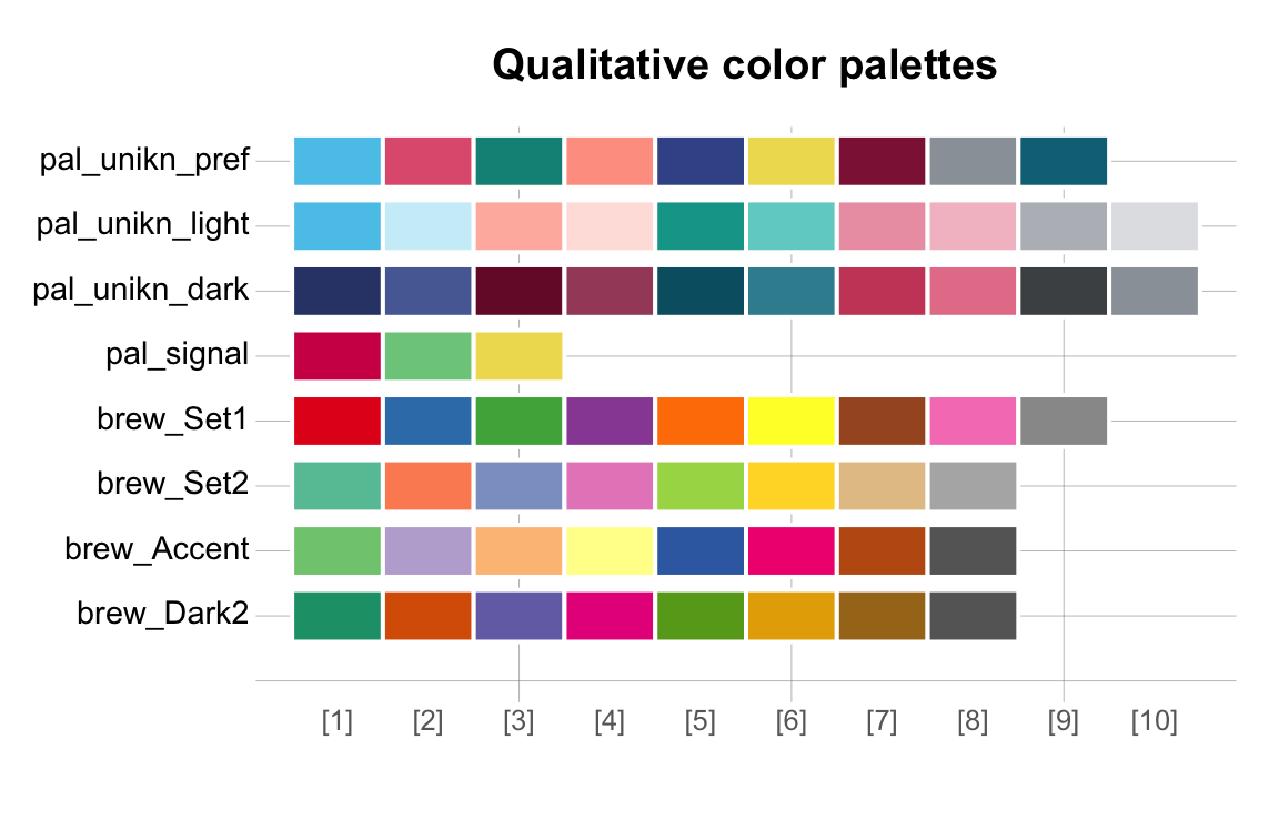 Other taxonomies of color palettes exist. For instance, the paletteer package primarily distinguishes between discrete and continuous palettes. Within the class of discrete palettes, fixed width palettes are distinguished from dynamic palettes. (Both continuous and dynamic palettes are sequential.)