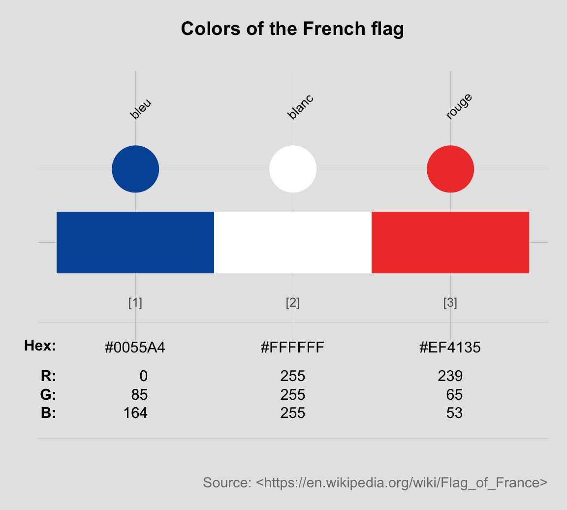 Note that, in R, each HEX code is represented in character type, with the hash tag # as a prefix.