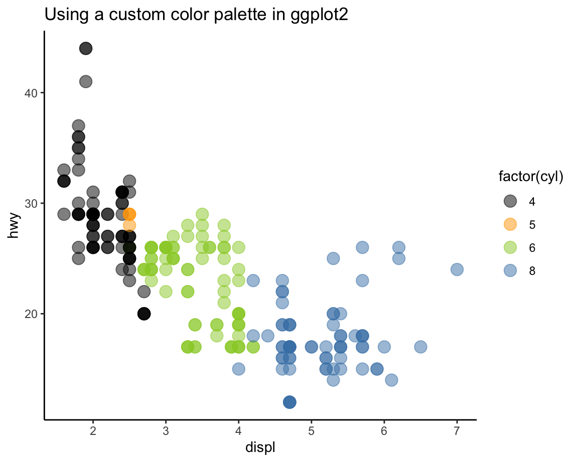 geom_point(aes(x = displ, y = hwy, color = factor(cyl)), size = 4, alpha = .5) +