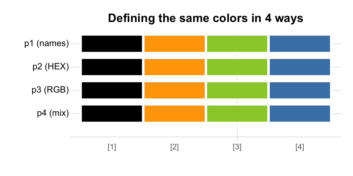 Importantly, the vast majority of colors can be expressed in any system and can thus be translated from one system into another (though some features, like color opacity, may get lost in translation). The following example shows how a vector of colors can be defined in multiple ways.