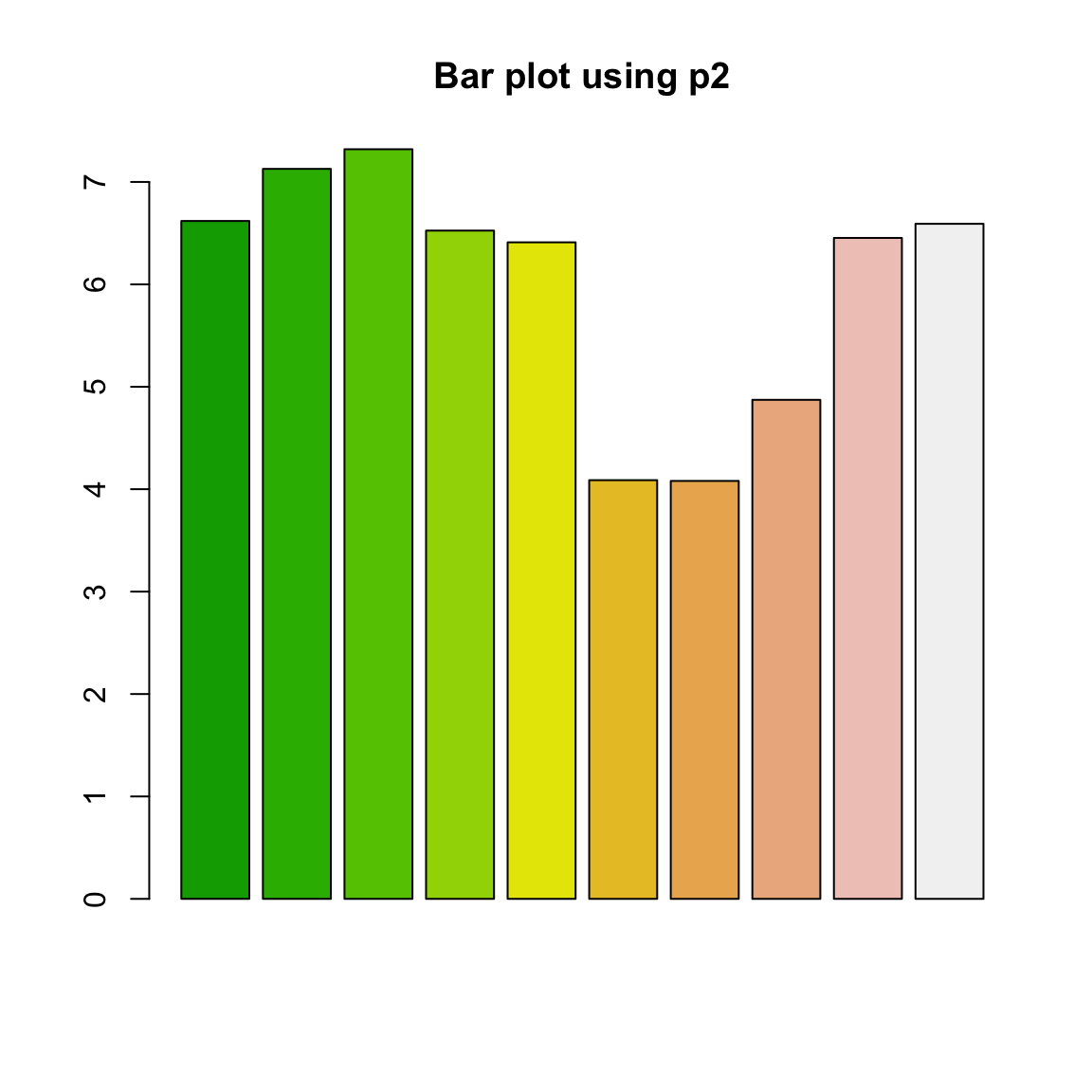 barplot(runif(10, 4, 8), col = p2, main = "Bar plot using p2")