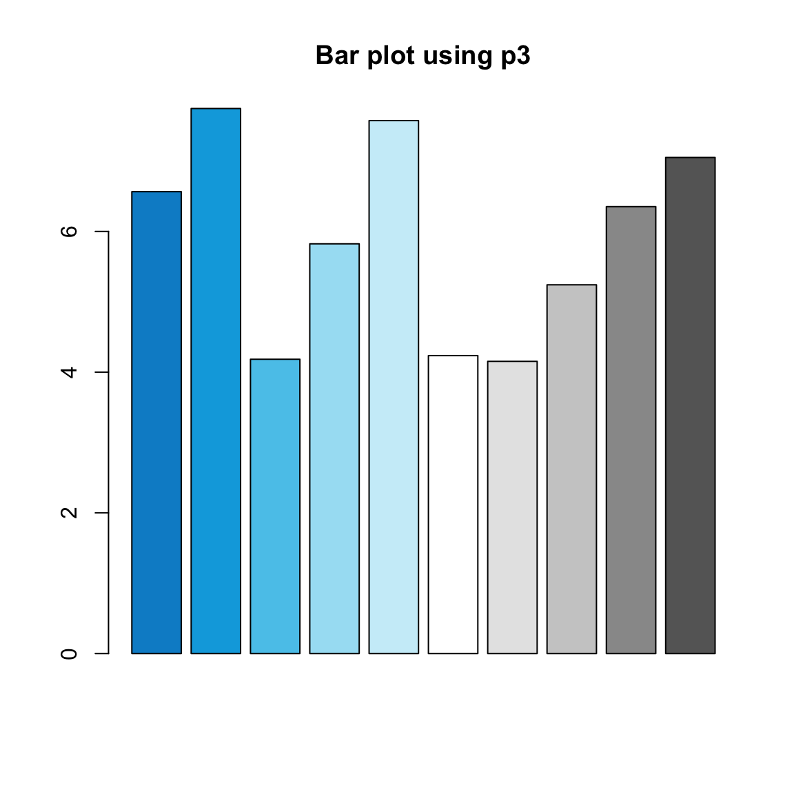 barplot(runif(10, 4, 8), col = p3, main = "Bar plot using p3")